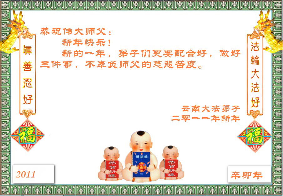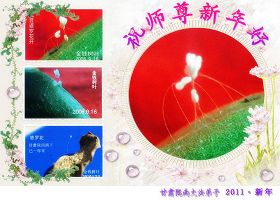 【明慧网二零一零年十二月三十一日】从二零零二年开始,世界各地的大法弟子纷纷在元旦之际,将发自内心的节日贺词、自制的贺卡、诗歌等寄给明慧网,向慈悲无私的师尊李洪志先生恭祝元旦快乐。这里收集的只是中国大陆大法弟子制作的部份二零一一年贺卡,作为元旦贺词的开篇。更多的元旦贺卡和贺词集,将汇集在今明两日发表。明慧编辑部在此谨代各地大法弟子相互问好,并恭祝大法同修共同精進、再精進,救度更多世人!