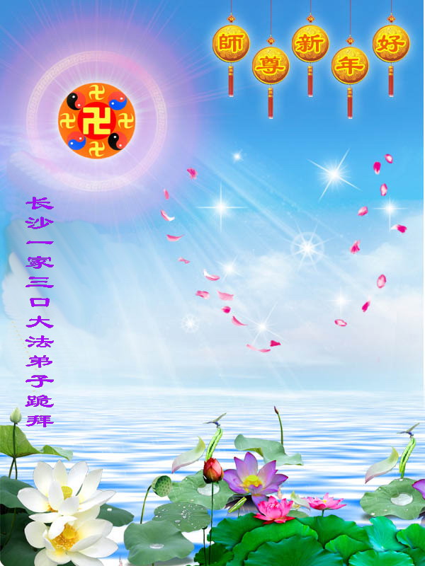 尊敬的师尊:新年好!我们想念师父,盼望师父早日回国。大雪纷飞,喜迎新年。我们家也开了一朵美丽的小花,莲花朵朵迎师尊,佛光普照全宇。正念除恶多救人,精進实修法入心。