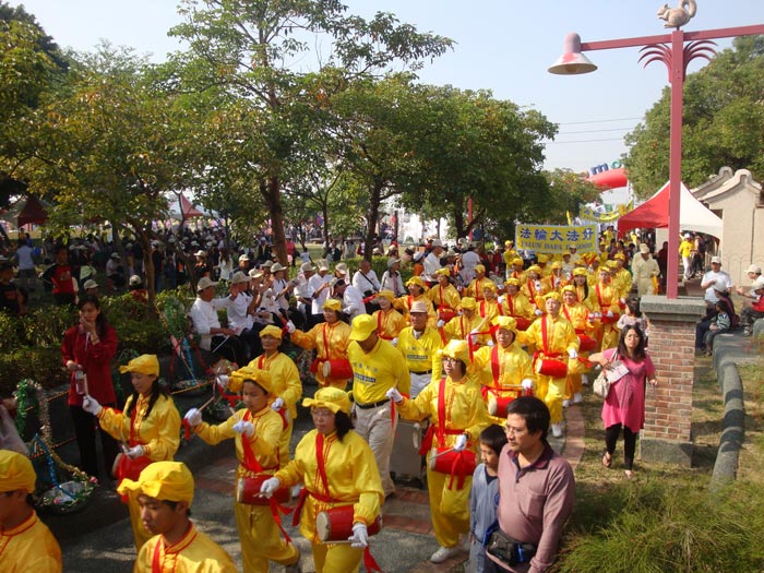 由法轮功学员组成的炼功队伍和腰鼓队,在绵长的千人踩街行列中最为耀眼夺目。金黄的服饰、裹头巾和冬冬的鼓声,吸引店家和路人目光,另有学员沿路分送法轮大法真相资料,现身说法自己因修炼法轮功而受益,以及所体验到的美好,告知热切期待的乡亲路人说:“桥头国中县民学苑每周二晚上七点半有法轮功学习班,每天早上在五林国小有免费教功。”
