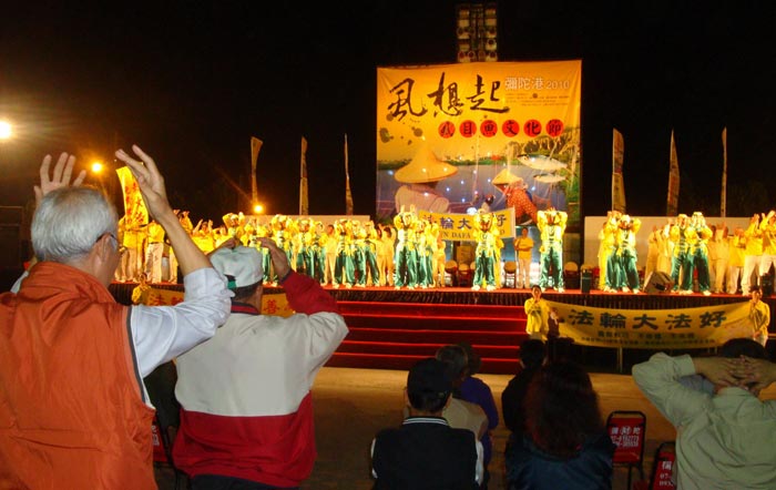 ![]() 二零一零年弥陀乡“虱想起-虱目鱼文化节”,二零一零年十二月四日晚间艺文活动中,法轮功学员演示功法,市民也在台下学炼起来。 |