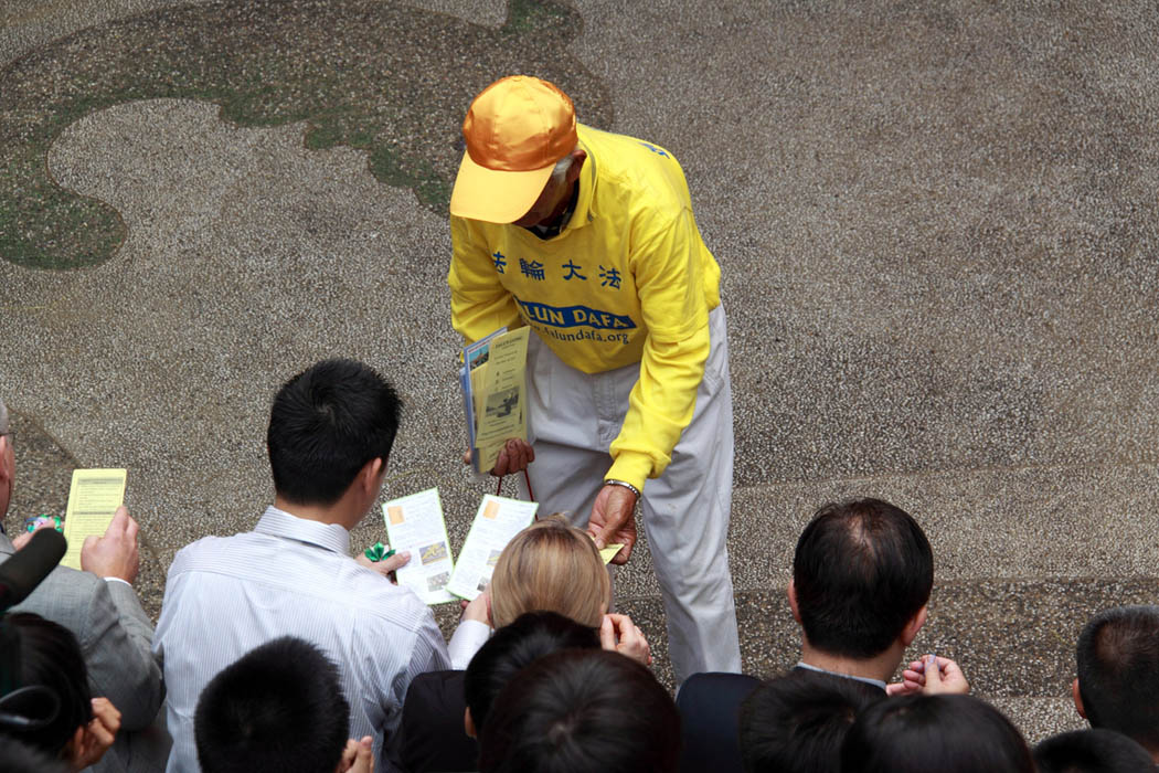 现场,主办单位细心的安排翻译设备,方便外国贵宾了解活动内容,司仪介绍法轮功学员组成的腰鼓队的表演,学员也准备了中、英文版的法轮大法简介及手制莲花分赠与会人员,许多贵宾不约而同将印有法轮大法字样的莲花挂在胸前,真是好看。
