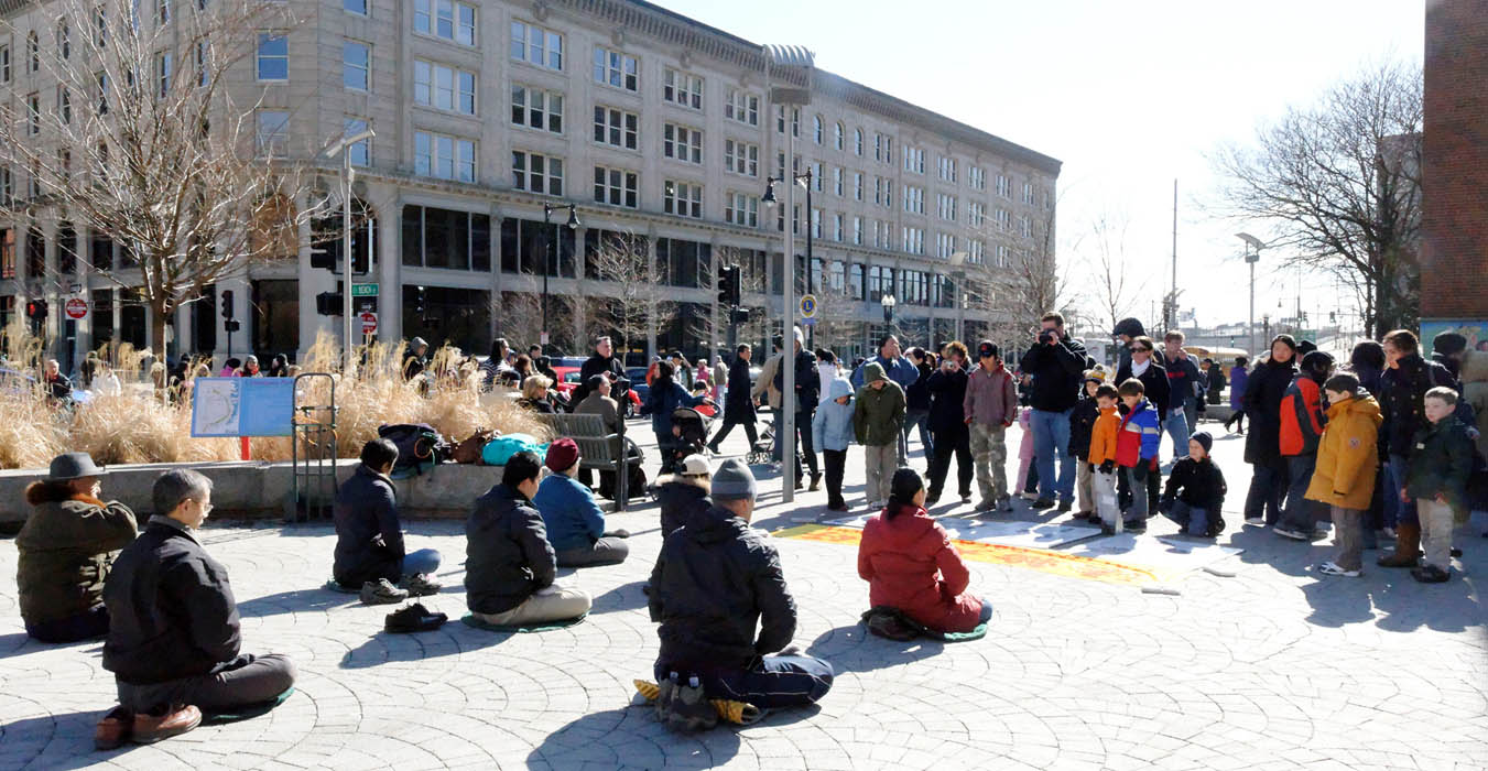 ![]() 法轮功学员在波士顿中国城安详而宁静地炼功,吸引了过往民众的驻足。 |