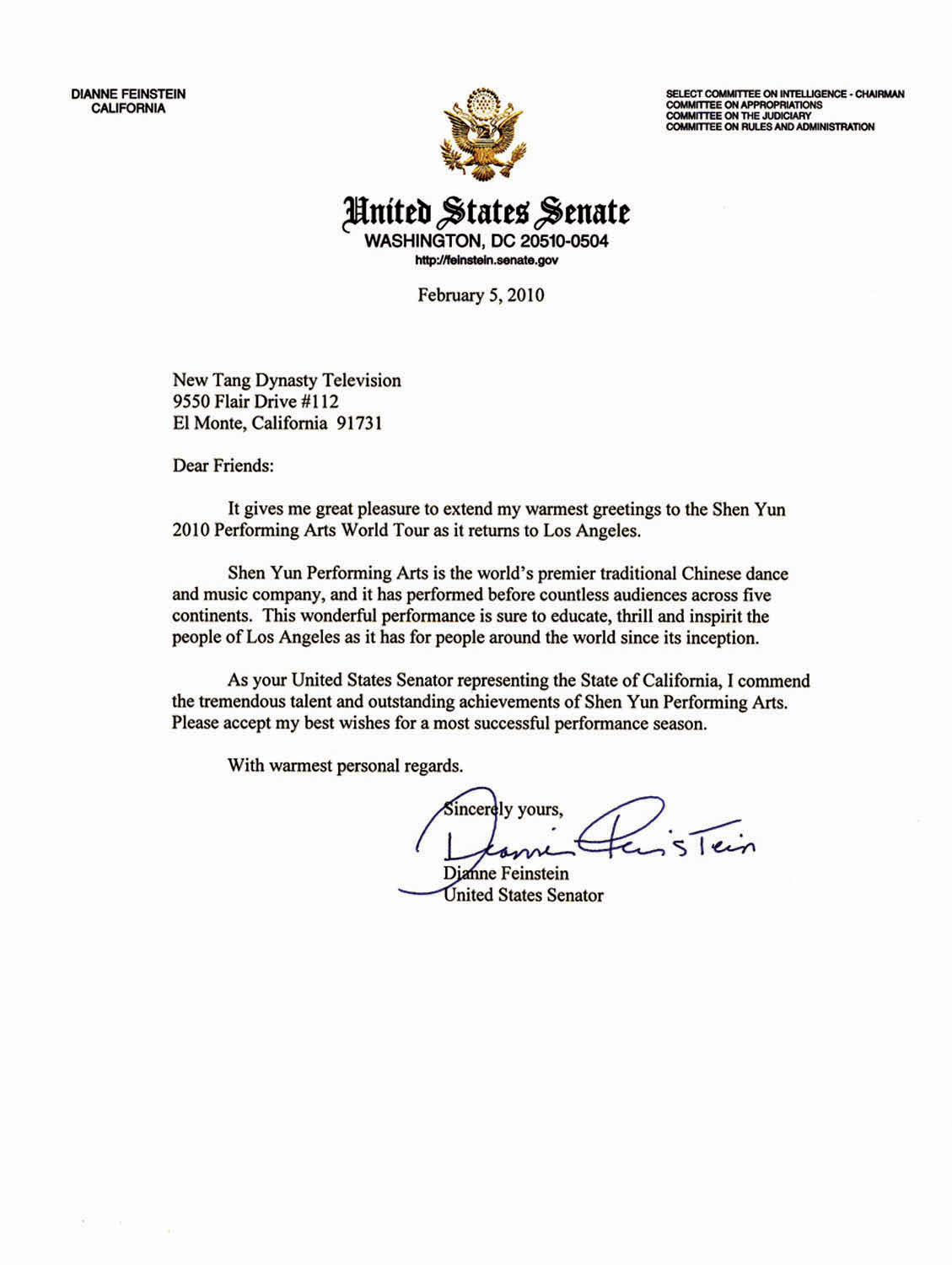 联邦参议员范士丹(Dianne Feinstein)在贺信中说:“我非常荣幸的对神韵艺术团全球巡回演出回到洛杉矶表示最热烈的问候。”她说:“作为代表加州的美国参议员,我赞扬神韵艺术团的巨大天赋和杰出成就。”