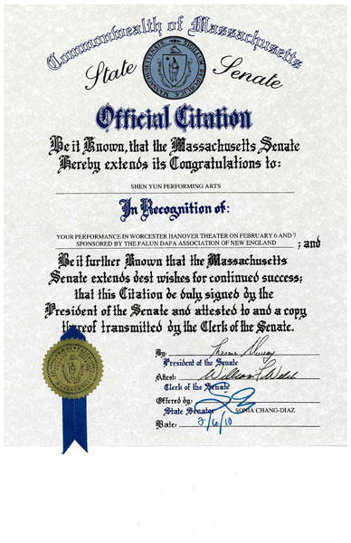 美国联邦参议员约翰•克里(John Kerry)在褒奖令中说:“我很荣幸能与新英格兰法轮大法协会一起欢迎神韵艺术团来到麻州。随着神韵艺术团莅临波士顿和伍斯特市进行演出,我想起霍比印第安部落的一句古谚:‘欣赏我们的舞蹈就如同倾听我们的心灵之声。’我要感谢新英格兰法轮大法协会带给麻州观众聆听中华文化之声的机会。我对华裔社区将继续成为麻州重要资产充满信心。感谢所有付出时间及精力使得这部展现中国文化和价值的庆典成为现实的人。”