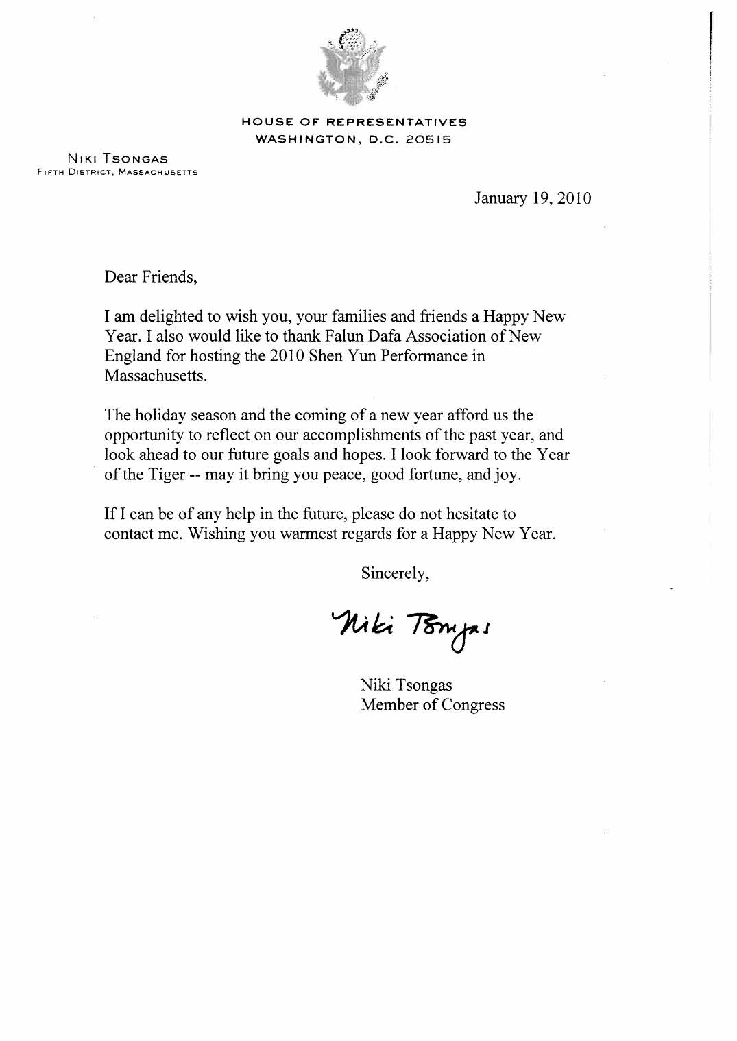 美国联邦众议员妮基•桑格斯(Niki Tsongas)在褒奖令中说:“感谢新英格兰法轮大法协会在麻州主办2010年神韵新年晚会。节日期间和新年来临之际,让我们有机会回顾过去一年取得的成就,同时展望未来的目标和希望。希望虎年带给你们宁静,财富和欢乐。今后如果需要我的帮助,请立即和我联系,不用迟疑。最亲切的祝愿新年快乐。”