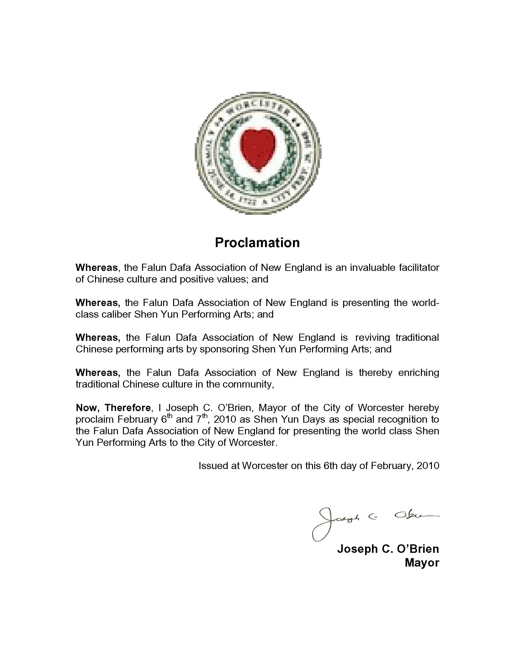 因此现在,我,约瑟夫•欧博瑞恩,作为伍斯特市市长宣布2010年2月6日及7日两天为‘神韵日’,以褒奖新英格兰法轮大法协会为伍斯特市带来神韵晚会。”