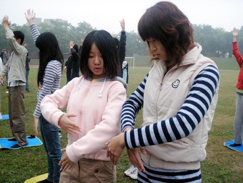 ![]() 小组长细心纠正炼功动作 |