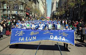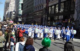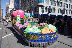 在一百五十个队伍中,有一支法轮功学员组成的队伍,包括法轮功天国乐团、炼功队和花车。这支不同凡响的队伍给人们带来了格外惊喜。当法轮功的队伍演奏着“法轮大法好”的乐曲经过时,旧金山居民艾丽森女士高兴地为法轮功天国乐团的演奏鼓掌。她表示,法轮功的乐团演奏的真是太棒了。当她了解到法轮功的原则是真、善、忍时,她说:“太好了。真是太好了。”