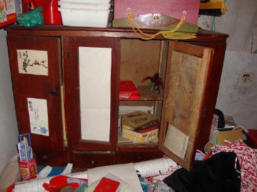 ![]() 高春红家的电视机、DVD播放机、现金、存折、手机、摩托车、自行车、大法书、光盘等东西被抢走。图为原来放电视机的柜子。 |