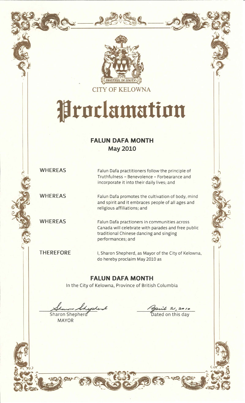 鉴此,我,卡罗纳市市长莎伦•谢波德(Sharon Shepherd),特此褒奖二零一零年五月为卡罗纳市“法轮大法月”。