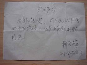 一天,她出人意料的提笔写下了一页字,细看竟是“严正声明”(下图)。她开始学法,有时能连读两三页,高兴时能连读十几页。她清醒的时刻越来越多,很少喃喃自语了,穿戴的也更加干净整齐,看起来离康复之日不远了。