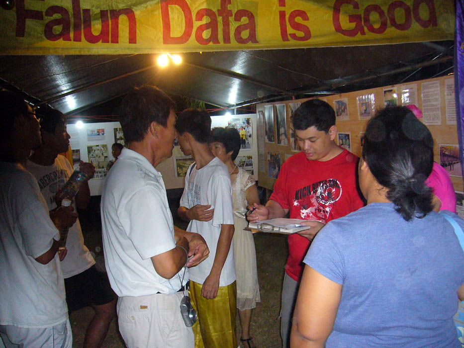 在展厅里人们不时的提问着各种问题,大法弟子都耐心的解答着。在酷刑展图片前很多观众对这些残酷的刑罚和血腥的镇压觉得不可思议和震惊,当他们明白真相后,很多人在签名簿上签名,表示支持法轮功,要求结束这场惨无人道的迫害。有的竖起大拇指对大法弟子表示敬佩,有的当场就表示要修炼法轮大法,有的观众要求和大法弟子合影留念。