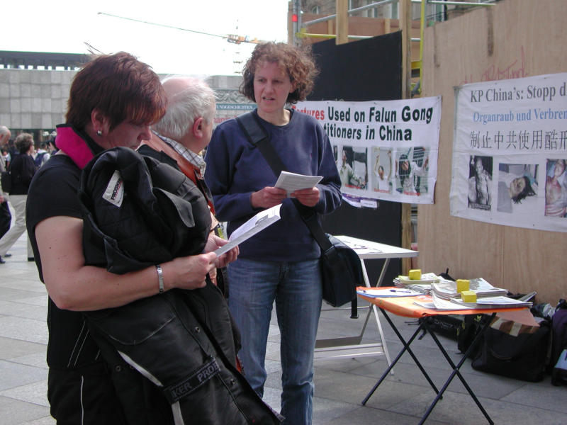 一个德国人走过真相展台说:迫害法轮功的事几年前我就知道了,现在还继续着,真是不可思议。看来得给这里的政治家们施加点压力了,他们不能总是不痛不痒地和中国(中共专制政权)谈一谈就完事了。