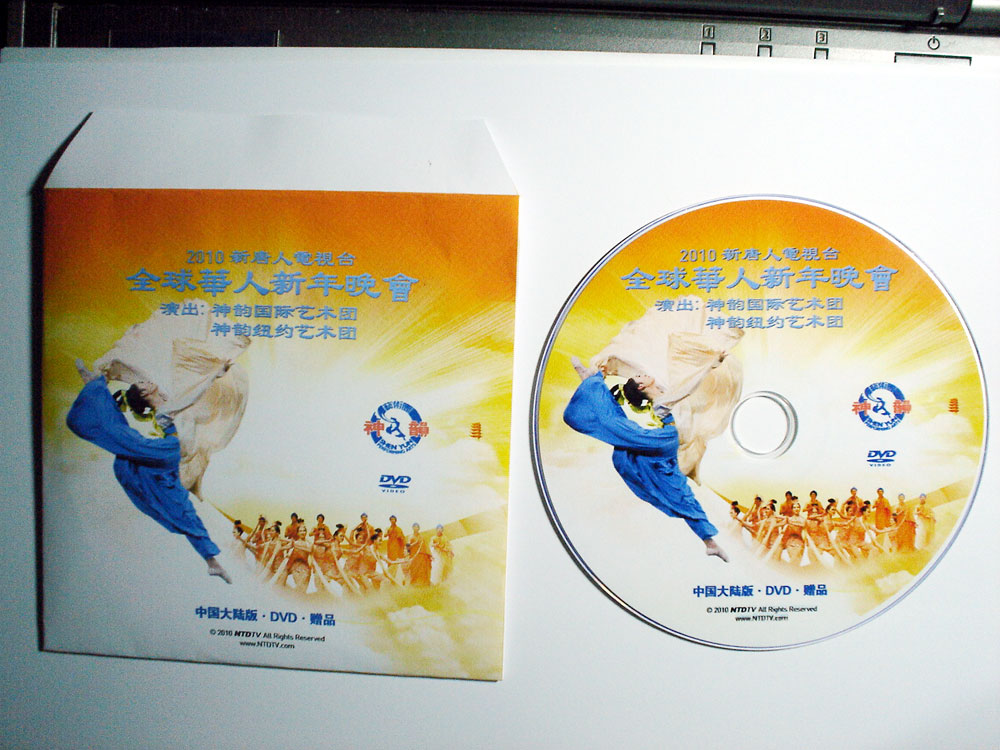 光盘的封套和贴上盘贴的光盘请看下图。用喷墨打印纸打印,今年的神韵光盘制作,明慧网有提供打印文件。一张喷墨打印纸只能制作一个封套。