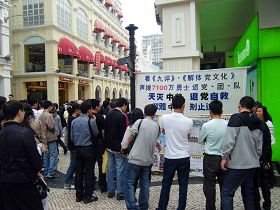 议事亭前地是澳门市中心的繁华地段,集商业、金融、政治于一身,也是游客必到之处,假节日有时人山人海。学员们逢星期六、日、假节日下午,就来这里讲真相,把法轮大法“真、善、忍”的美好告诉大家,与有兴趣的人分享学员修炼后亲身受益的体会,同时揭露中共迫害法轮功的真相,启迪人们的理性,勿受中共谎言蒙蔽,早日认清中共本质,退出中共,选择美好的未来。