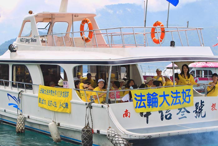 雨后的日月潭在阳光普照下,正所谓春光明媚。法轮功学员们纷纷搭游艇游湖,让游艇一时成了“法轮大法好”游艇,在日月潭上穿梭。