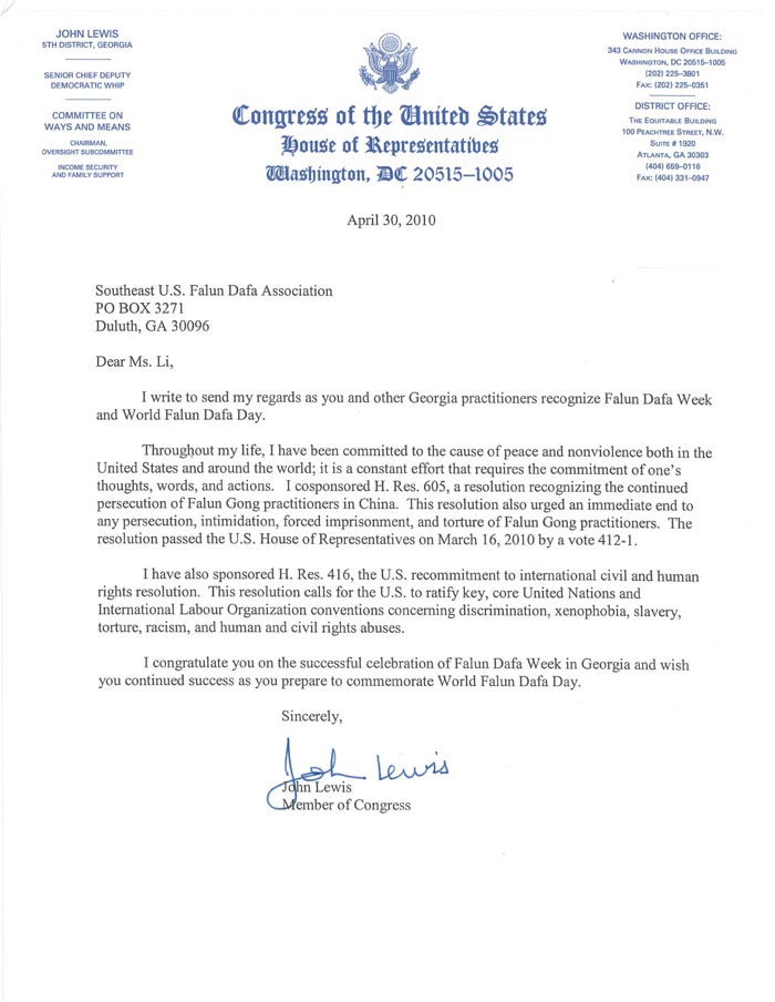 “在我的一生中,我一直致力于美国和世界各地的和平及非暴力的事业,这是一个需要我们每一个人不断地去思考、呼吁、和付诸行动的、不懈的努力。我是众议院六零五号决议的共同发起人,该决议揭示了在中国对法轮功修炼者的持续迫害。这项决议还呼吁立即停止任何对法轮功修炼者的迫害、恐吓、非法监禁、及酷刑折磨。六零五号决议于二零一零年三月十六日在美国众议院以412票对1票表决通过。