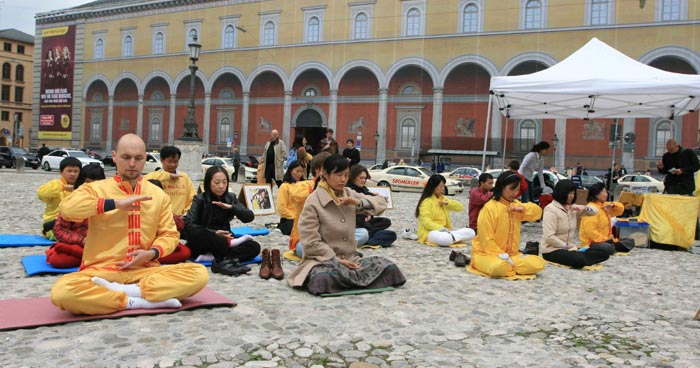![]() 法轮功学员在慕尼黑王宫和国家歌剧院前的马克斯-约瑟夫广场(Max-Joseph-Platz)展示法轮功功法 |