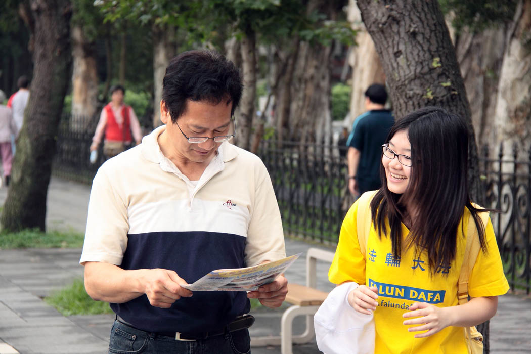 在路上发送《九评共产党》真相小册子的胡伯伯,笑容可掬地告诉过往的中国旅客“法轮大法好”、“真善忍好”、“退党保平安”,他和蔼可亲地说:“我这么大把年纪绝不会骗人,我要说的话就得是真话。”