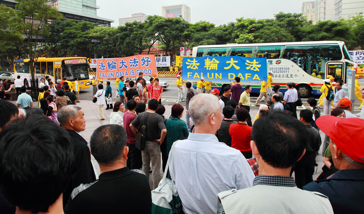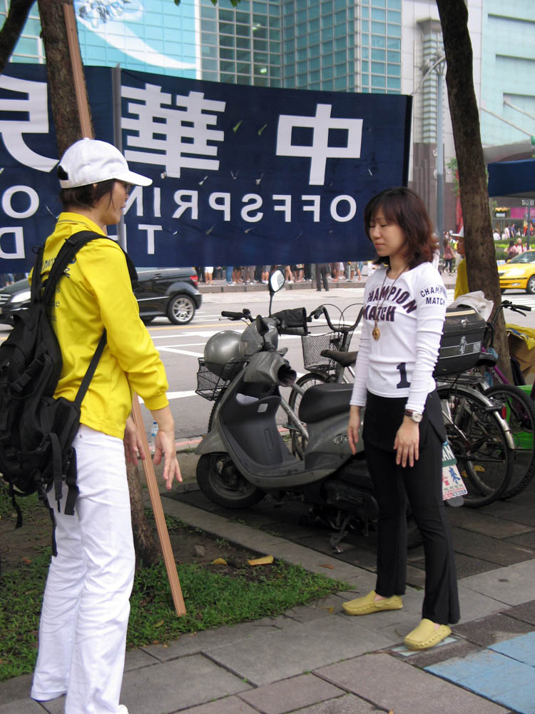 来自上海的四位观光客,趁着等候游览车的时候,特地越过马路来到信义广场学员集体炼功的场面前合拍照片,听到台湾同胞说:“唷,上海大都市,见的世面多。”王先生顺口回答:“哎,谈不上,谈不上。说见过世面,可没见过这样的场面(手指着学员集体炼功的场面),所以要拍照带回去纪念,一切就尽在不言中了。”
