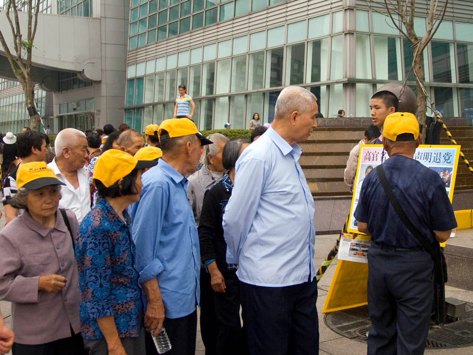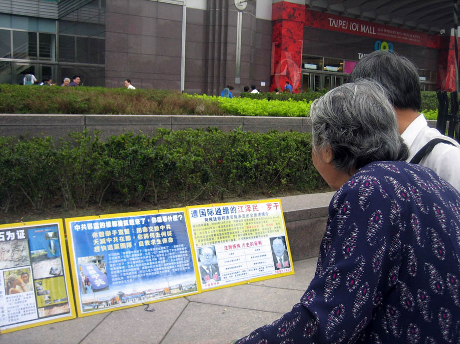 ![]() 中国游客仔细地看着江泽民、罗干在海外被告的讯息 |