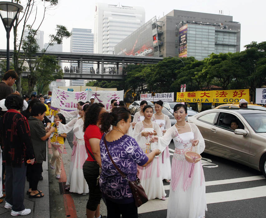 下午三点多,游行队伍由声势浩壮的天国乐团开路,用一首首庄严的乐曲告诉台湾民众大法在世界的洪传。接着笑容可掬的仙女队、小弟子腰鼓队和展示法轮功五套功法的炼功方阵都引起许多行人的围观与摄像。