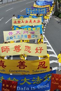 二零一零年五月九日,来自日本各地的法轮功学员在东京繁华市区举行游行,庆祝即将到来的第十一届“世界法轮大法日”、法轮大法洪传十八周年,并恭祝法轮功创始人李洪志先生五十九岁华诞。
