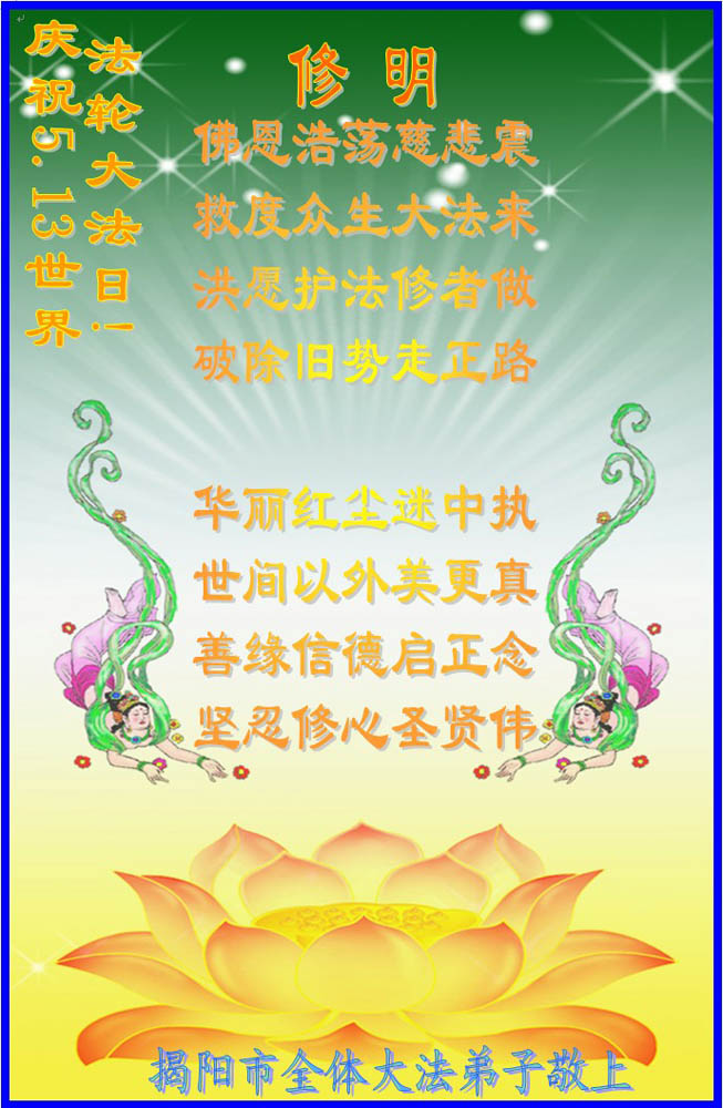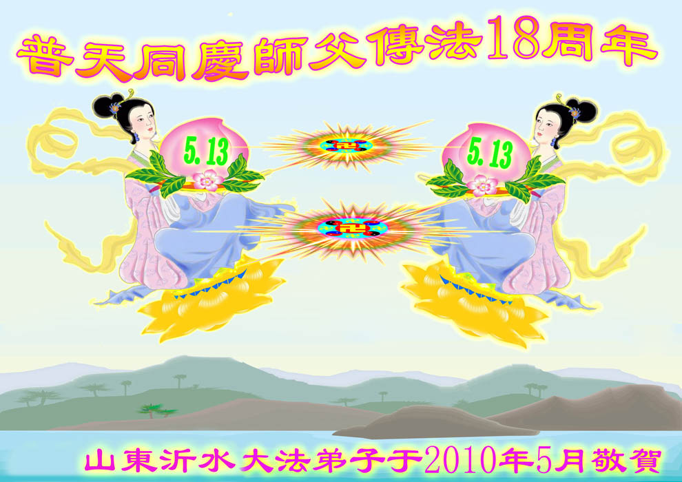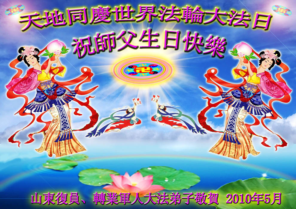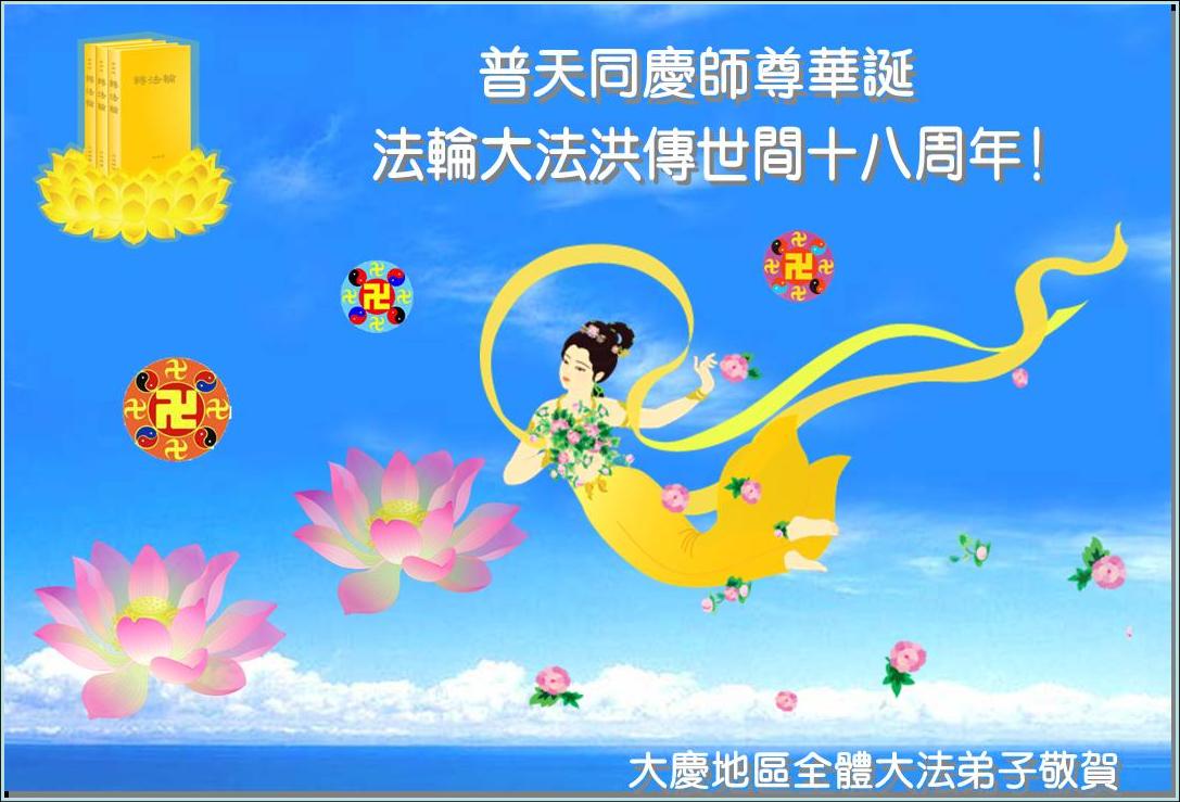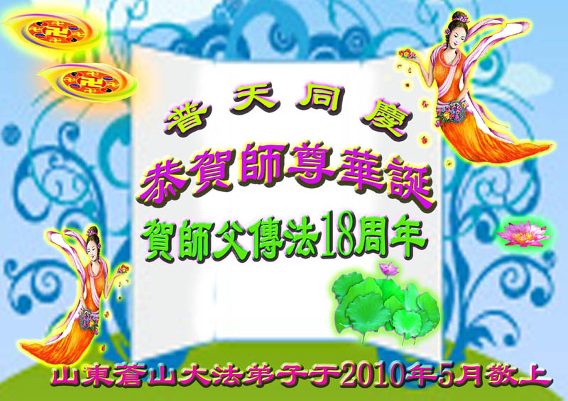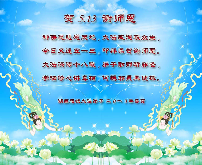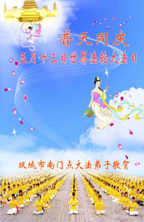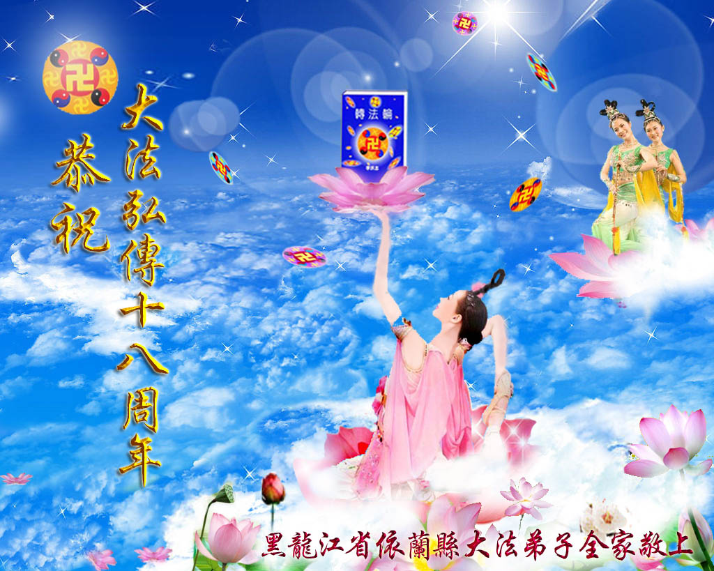 普天同贺!法轮大法好!让法轮大法好的呼声永远在苍宇中回荡!