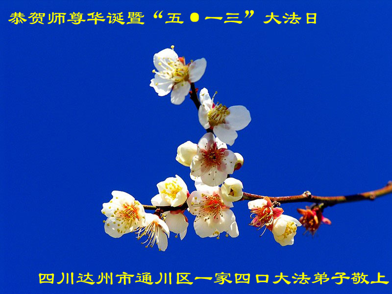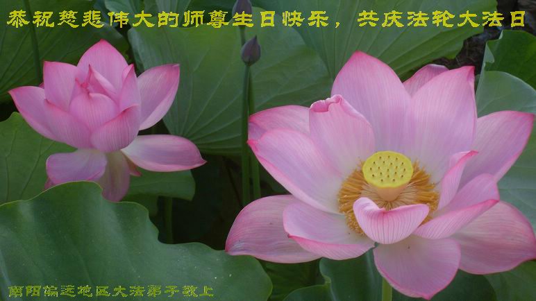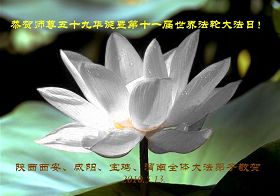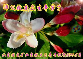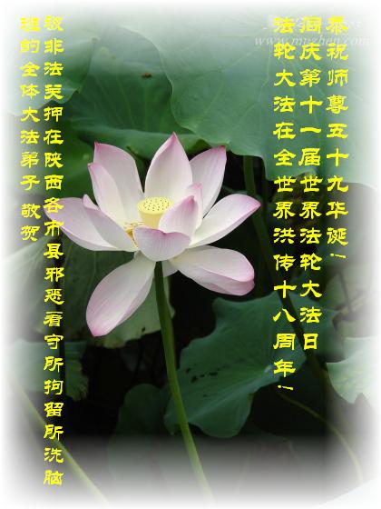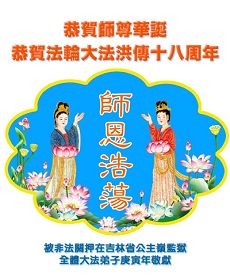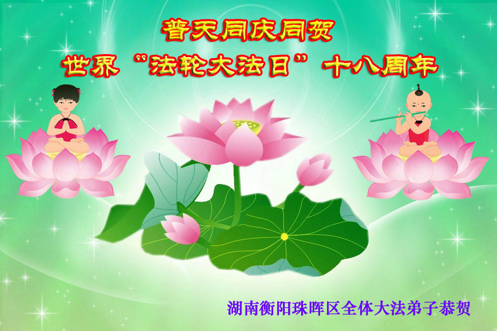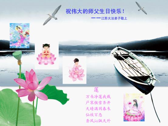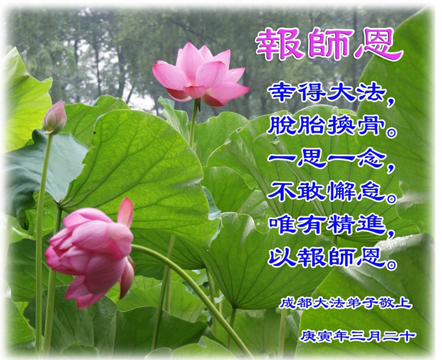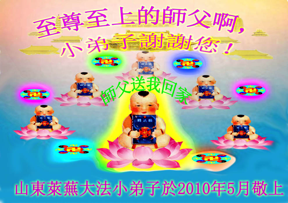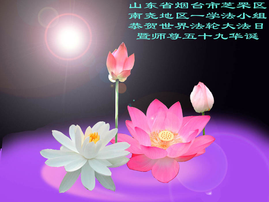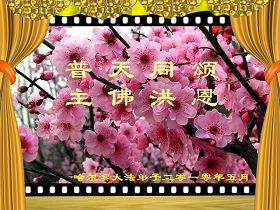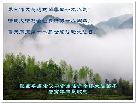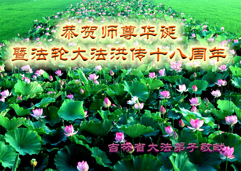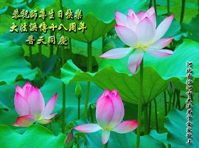 在这普天同贺师尊五十九岁华诞暨法轮大法洪传十八周年之时,我们回首得法十五年走过的历程,特别是邪党掀起的血雨腥风的十一年中,我们在浩荡的佛恩中一步步走到今天。在做好“三件事”中,我们深深体悟到“邪恶疯狂不迷途 除恶只当把尘拂”(《志不退》),佛法带给了我们心灵上的宁静、祥和。我们深知在这大穹巨变之际,我们距“正法时期大法弟子”的标准还相差很远,但是我们会用大法赋予我们的能力、智慧救度更多的世人,兑现史前大愿!此时我们更加思念伟大慈悲的师尊!