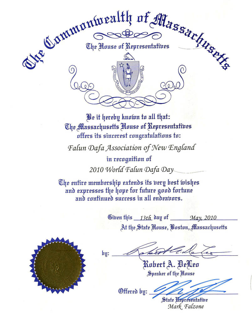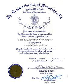 麻萨诸塞州众议院向新英格兰法轮大法协会致以最衷心的祝贺!