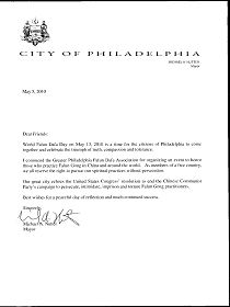 费城市长迈克尔·纳特二零一零年五月五日致信费城法轮大法学会,祝贺世界法轮大法日。