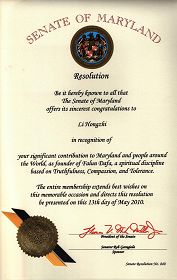 二零一零年五月十三日世界法轮大法日当天,与美国首都华盛顿相邻的马里兰州参议院通过八四零号决议案,赞誉法轮大法创始人李洪志先生对马里兰州及全世界人民的重大贡献。