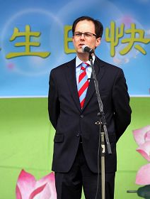 多伦多市第二十二选区议员候选人谢乐思(Chris Sellors)也到场祝贺法轮大法日。他在发言中说:“我今天来到这里,是为了人权,是为了真、善、忍。”