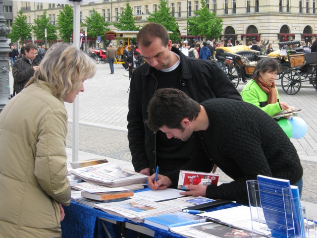 ![]() 在柏林著名景点博兰登堡门前,人们纷纷在法轮功展位上签名谴责中共迫害法轮功 |