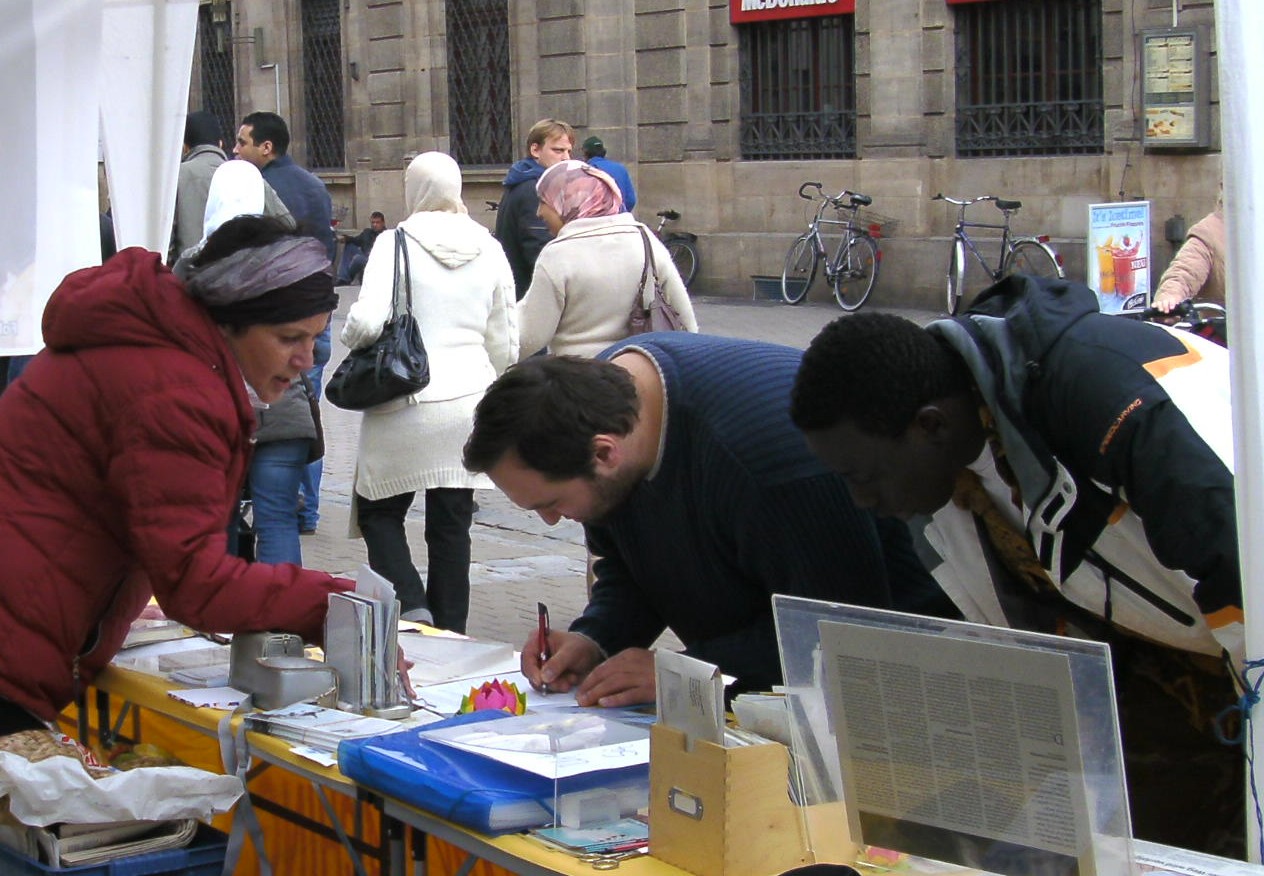 位于德国南部慕尼黑附近的埃尔朗根(Erlangen)是座大学城,五月十五日,附近的法轮功学员将法轮功的真相带到了这里,市民们在了解到法轮功被迫害的真相之后,纷纷签名反对中共活体摘取法轮功学员的器官。
