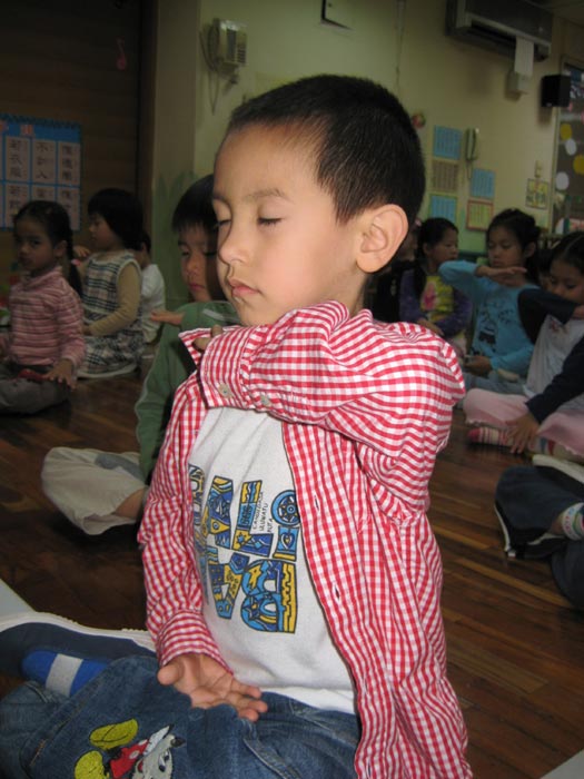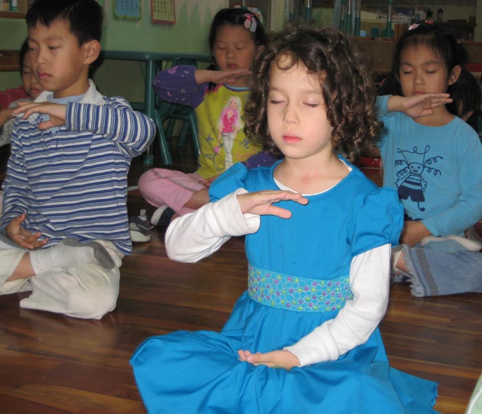 ![]() 真真(着蓝衣裙装)和小朋友一起炼静功 |