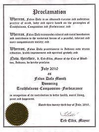 褒奖令鉴于,法轮大法是基于真、善、忍原则的上乘性命双修功法, 包括动功和打坐;并且鉴于,法轮大法超越文化和种族的界限,为建立一个祥和、忍让且更加包容慈善的社会所做出的贡献;并且鉴于,在印第安纳州的法轮大法修炼者证实修炼法轮大法能减轻压力、增进健康、提高精神境界; 鉴此,我,百乐夫顿市市长泰德•艾利斯,特此宣告二零一零年七月为印第安纳州百乐夫顿市“颂扬真、善、忍的法轮大法月”,以嘉奖法轮大法对增进健康、提高道德风尚的贡献。