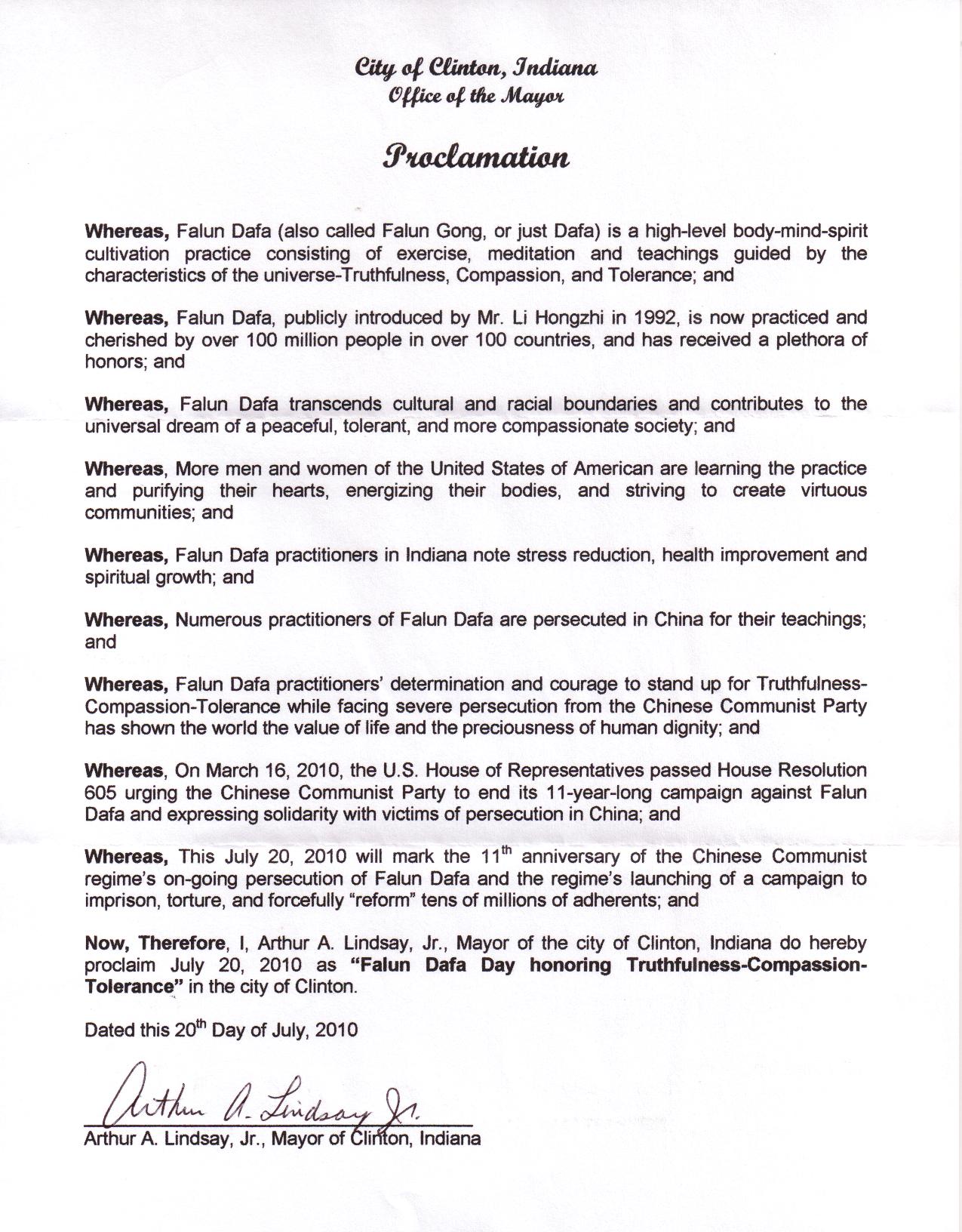 鉴此,我,印第安纳州克林顿市市长阿瑟•林德赛(Arthur A. Lindsay),特此宣告二零一零年七月二十日为印第安纳州克林顿市“颂扬真、善、忍的法轮大法日”。