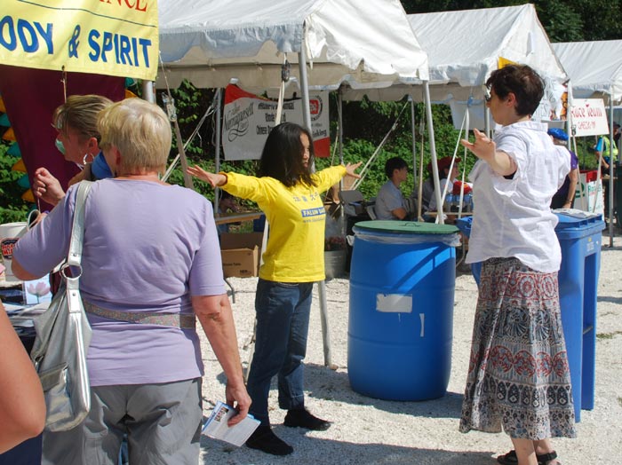 一位西人老夫人对法轮功还不认识,学员耐心地给他讲修炼法轮功的受益、中共对中国法轮功学员的迫害、海外学员反迫害的努力。老夫人听后,明白真相, 解开心锁,高兴地点头称是。