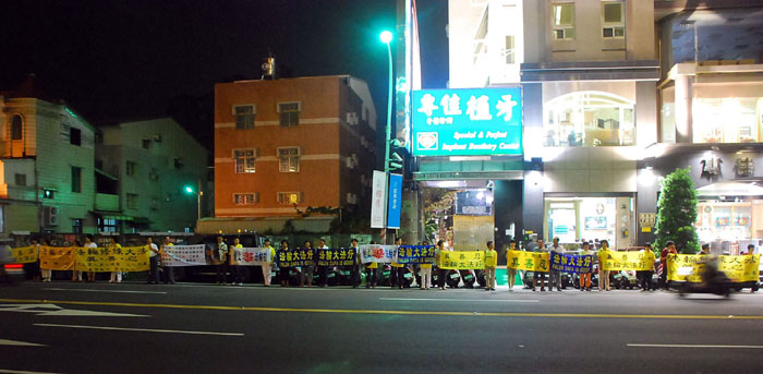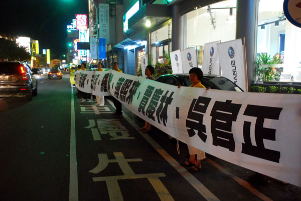 十六日晚上七点起,法轮功学员就在嘉义市耐斯饭店外面拉起横幅,上面写着:“中共高官江泽民、罗干、薄熙来、贾庆林、吴官正被西班牙刑事起诉”、“迫害法轮功 赵正永你被刑事控告了”、“迫害真善忍 天理不容”、“制止迫害法轮功”等文字。横幅沿着新生路从忠孝路口一直到台林街,绵延将近两百公尺。经过的车辆,驾驶者纷纷打开车窗向学员喊“法轮功加油”。