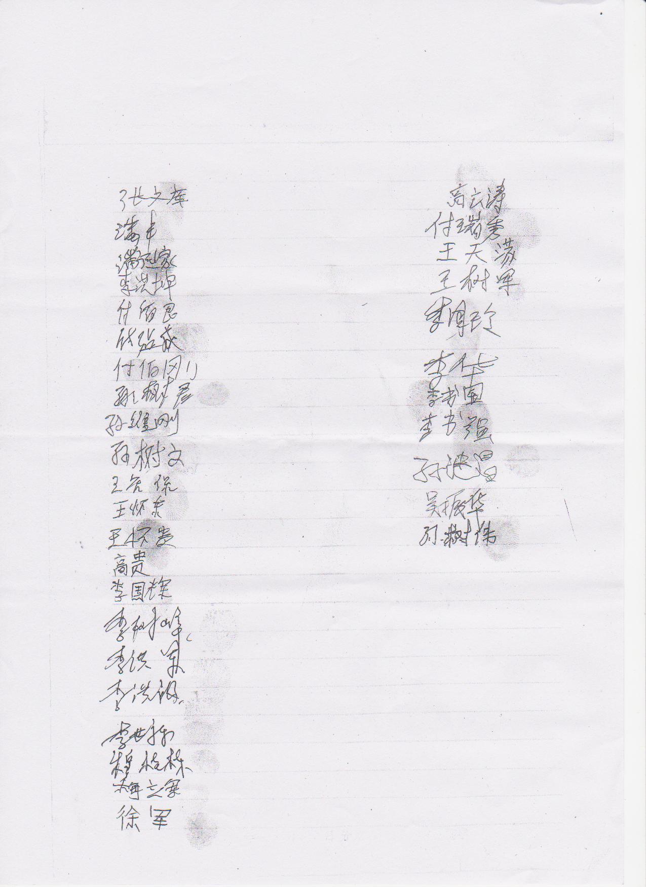 齐兴武、李广春、齐兴全、孟兆海、李国忠、于静、王淑荣、兵俊伟、张德义、孟宪君、齐兴双、文立成、郭华雨、王民生、徐铁刚、李岩、孙淑明、金大海、金大龙、徐凤菁、穆立春、李春喜、李广申、赵洪泰、张宇鹤、齐兴文、王殿全、张海霞、孙树岩、王德发、何少奎、王洪义、梅立臣、李树仁、李洪坤、李树良、李洪波、潘远航、李宏斌、韩国良、韩永久、韩国柱、李广友、李书斌、王文成、李文云、汪佳兴、张文库、潘丰、潘远家、李洪坤、付佰良、付建成、付佰刚、孙树君、孙维刚、孙树文、王庆保、王怀东、王怀贵、高贵、李国辉、李树峰、李洪军、李洪福、穆桂栋、梅立军、徐军、高云涛、付瑞秀、王天荡、王树军、李国玲、李华、李书国、李书强、孙继昌、吴振华、孙树伟、李广金、陈凤霞、刘永华、黄吉成、刘学东、李树凯、张淑青、李树臣、孙伟斌、刘英杰、徐五柱、刘涛、王树田、李书军、李长文、李国峰、李国伟