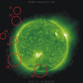 NASA环日立体摄影卫星在2010年1月18日前后拍摄到太阳周边的巨型球状飞行物,据观察者称,从其不同位置来看这些物体是运动的,根据其尺寸推断极有可能大如地球,甚至这些飞行物的直径是超过地球的。