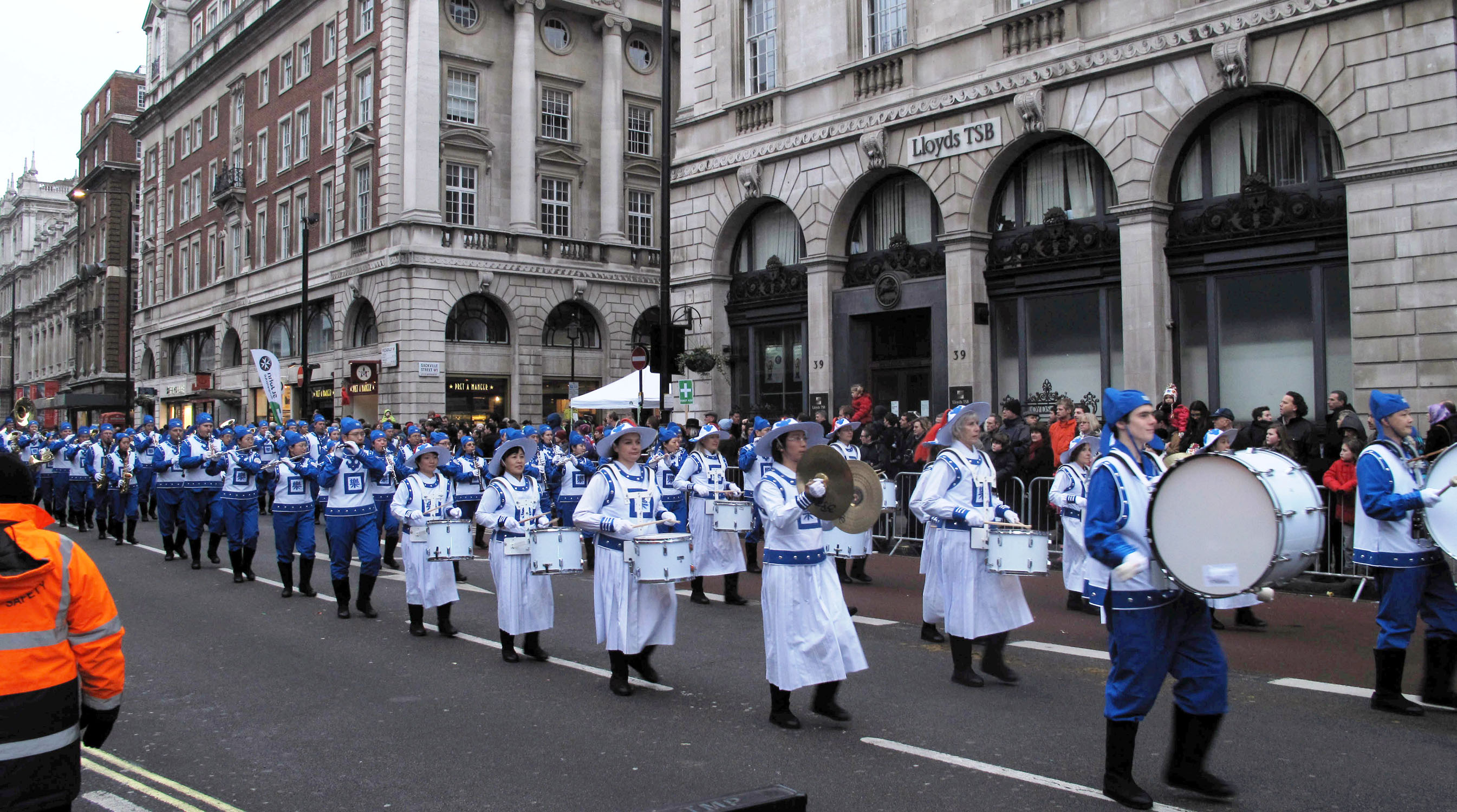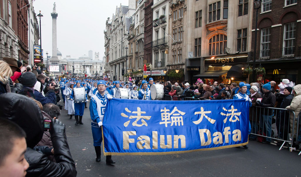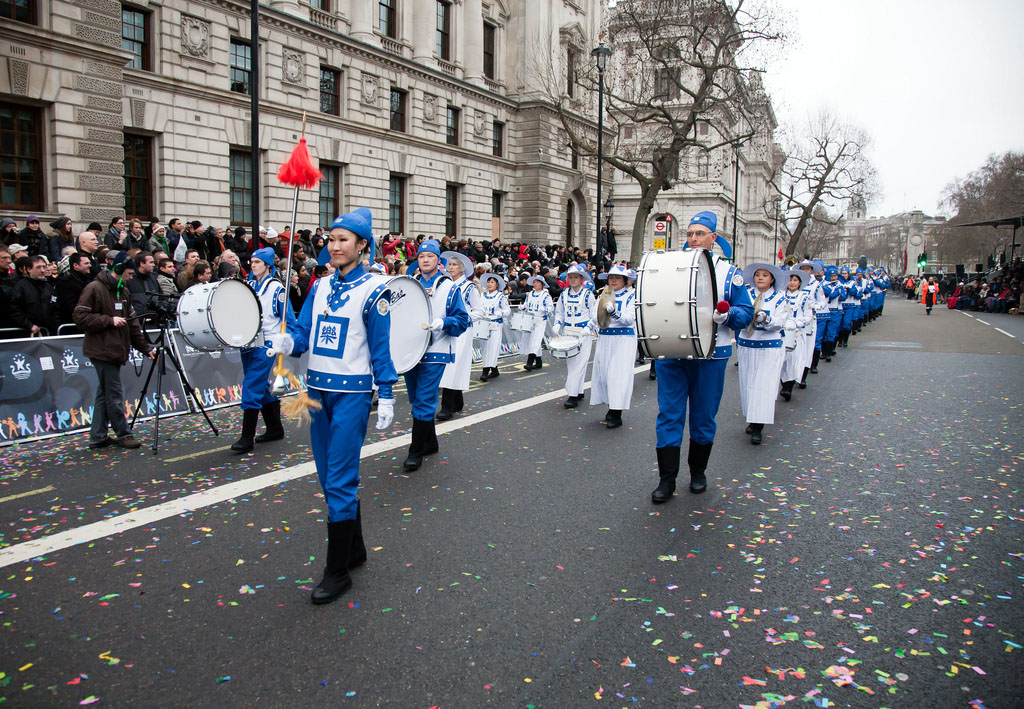 成立于二零零七年的欧洲天国乐团经常参与欧洲的各大节日游行盛典,在二零一一年的头一天,七十多位身着蓝白两色清新亮丽传统中式服装的天国乐团成员再次在伦敦精彩亮相,他们踏着整齐的步伐、吹奏着《法轮大法好》、《送宝》和《欢乐颂》等乐曲,把祥和美好的祝福带给了正在欢庆节日的英国民众以及来自世界各地的广大游客。