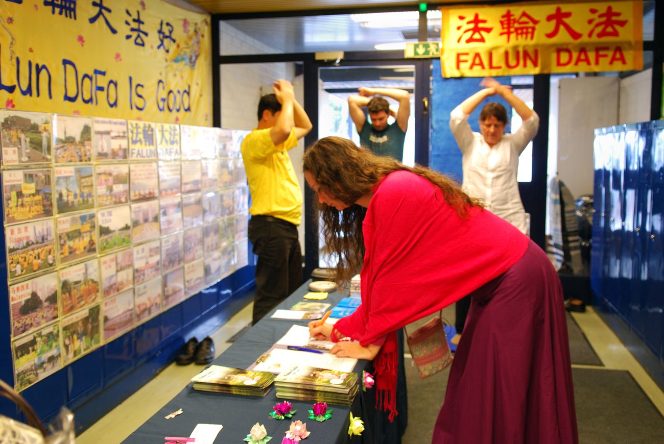 博览会的两天里,学员每天都有一个固定时间段来演讲,向观众进一步的介绍法轮功以及这场迫害。每次介绍大约五十分钟,前来参加的人不少,整个教室充满了祥和的气氛。