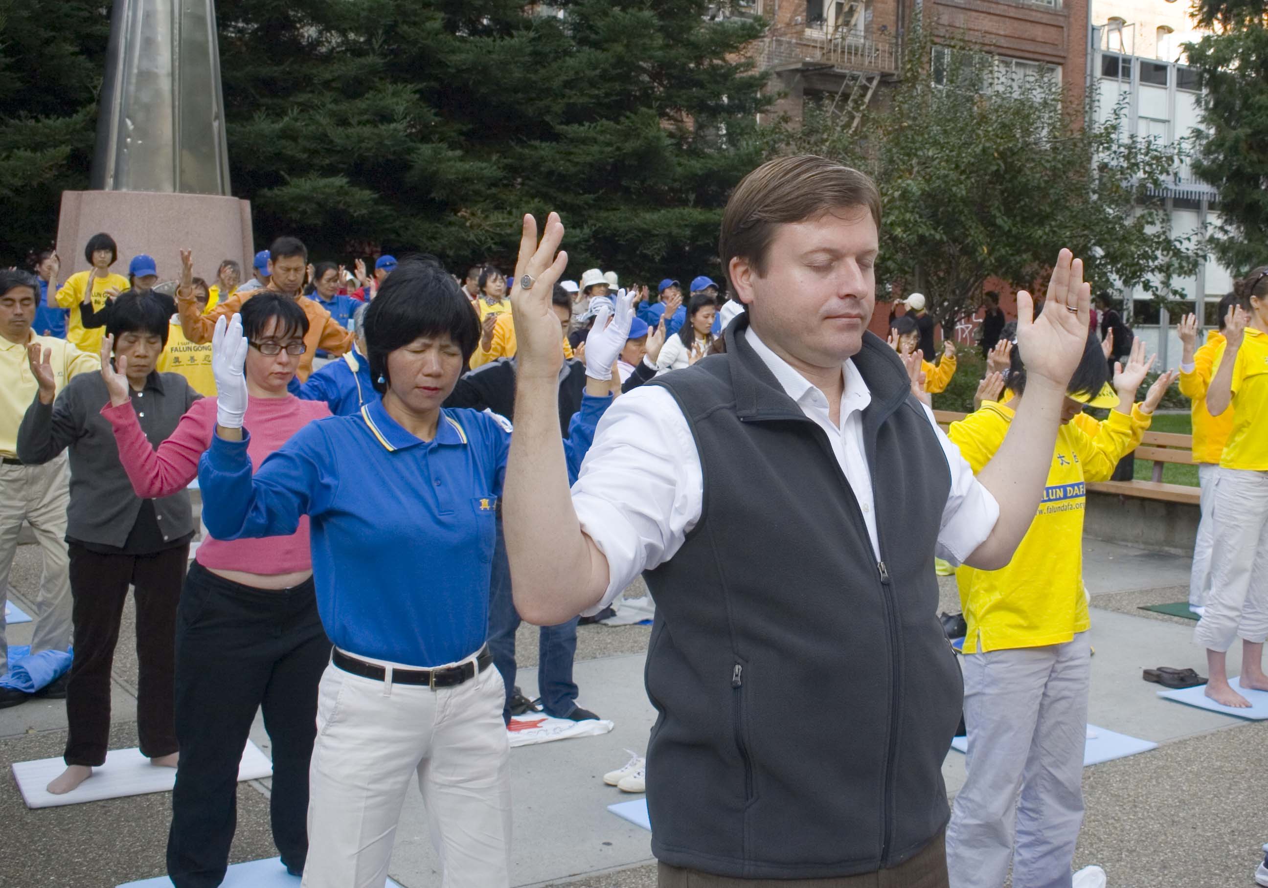 ![]() 法轮功学员在旧金山圣玛丽广场炼功 |