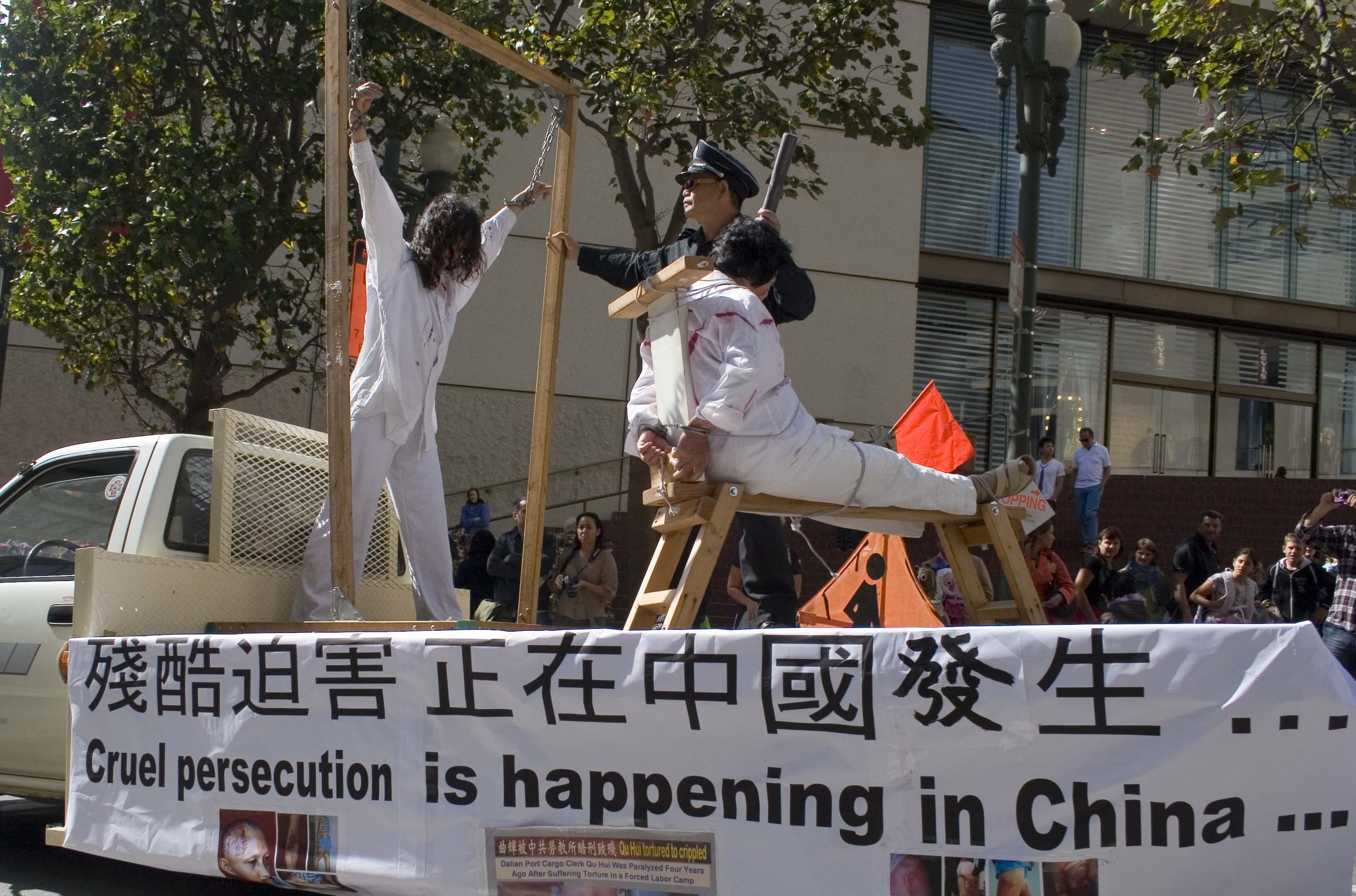 ![]() 演示中共残酷迫害法轮功的酷刑展车,并呼吁善良的人们伸出援手共同制止迫害 |
