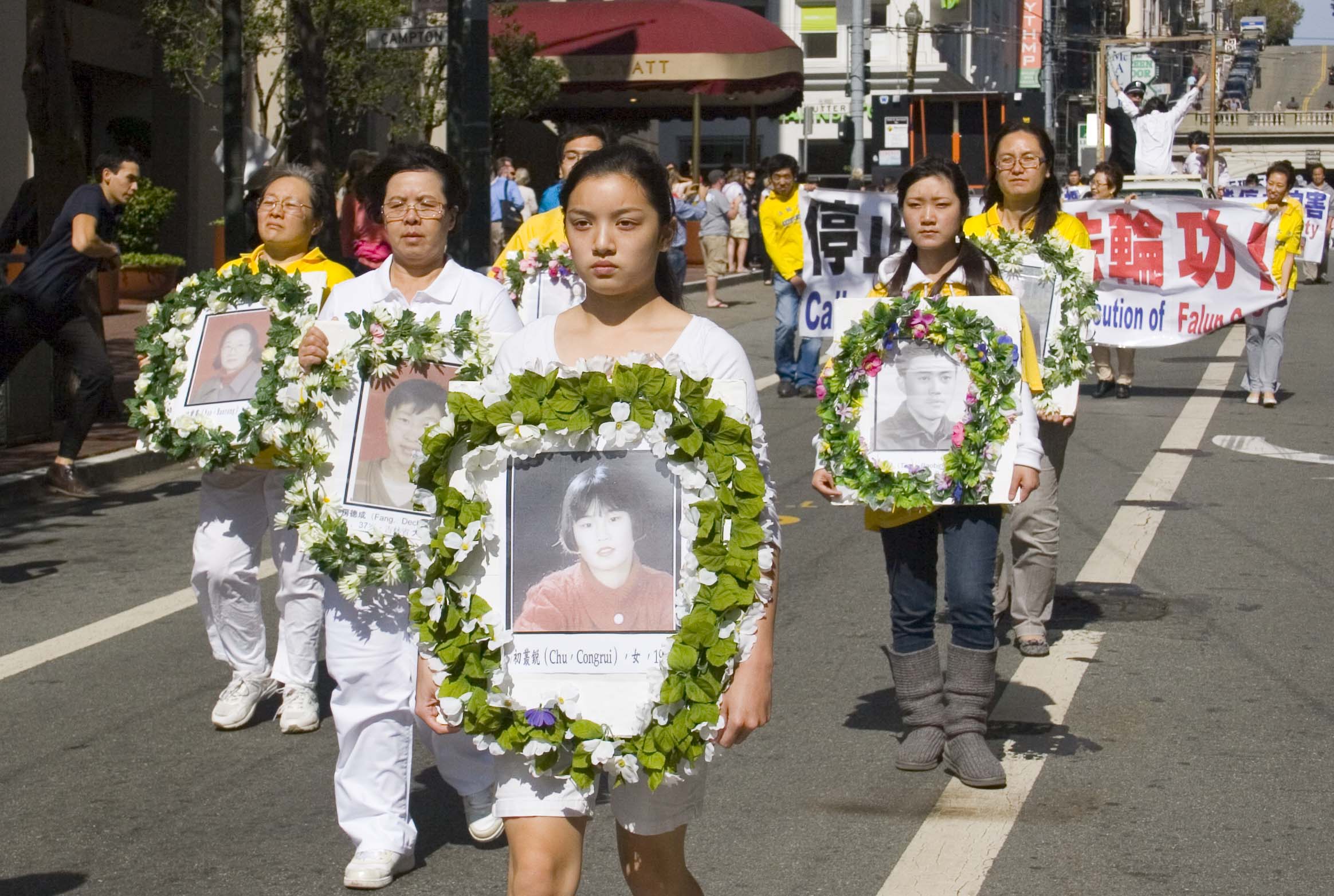 游行协调人张虹介绍,今天的游行有五个方阵:第一个方阵是由一百多人组成的“天国乐团”;第二个方阵是法轮功功法演示队伍;第三个方阵是由二十位女士手持去世法轮功学员照片的悼念队伍;紧接在后面的是揭露中共酷刑折磨法轮功学员的演示车辆;第四个方阵是反迫害队伍;最后一个方阵是各界人士组成的支持《九评共产党》和退党的队伍。