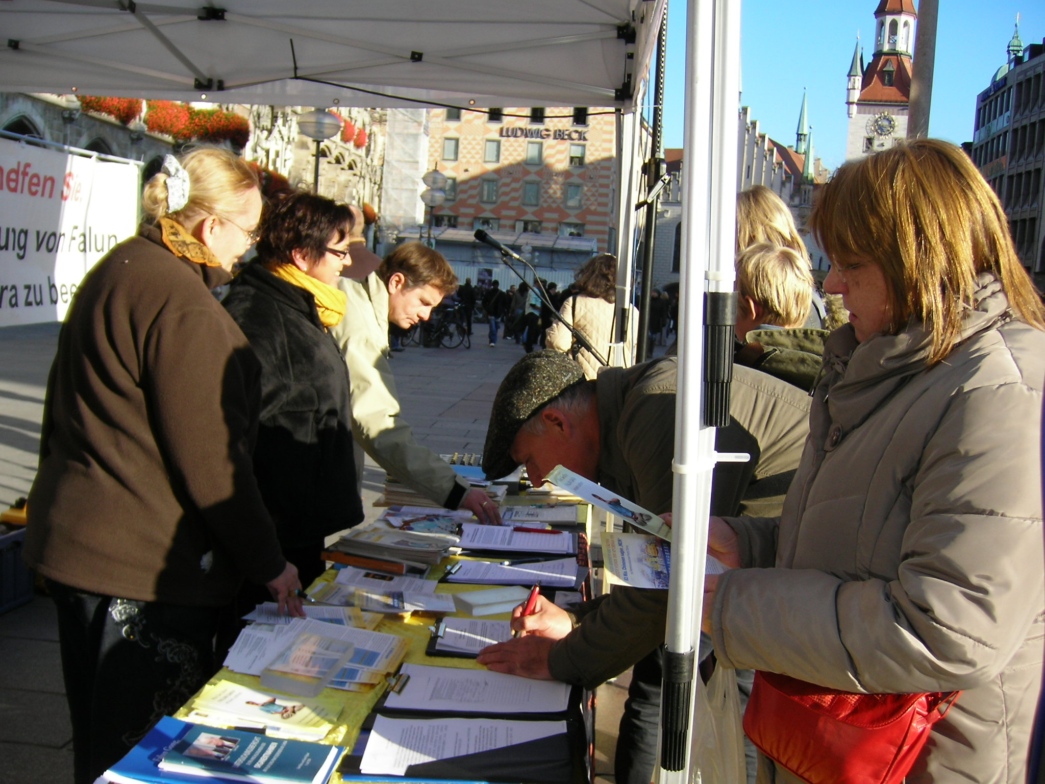 二零一一年十月二十二日,德国慕尼黑的法轮功学员在市中心玛琳广场(Marienplatz)上举办声援一亿四百万中国民众退出中共的活动,揭露中共邪党的罪行,告诉人们法轮功真相,规劝中国人退出邪党及其组织。