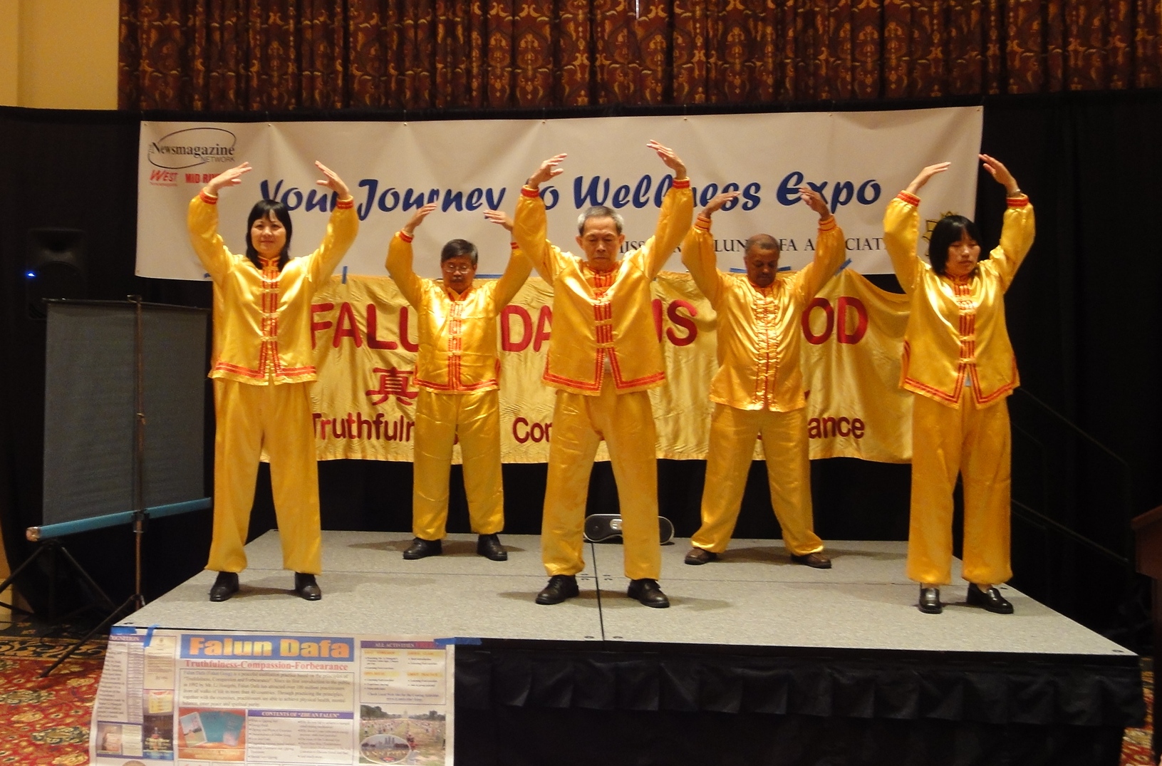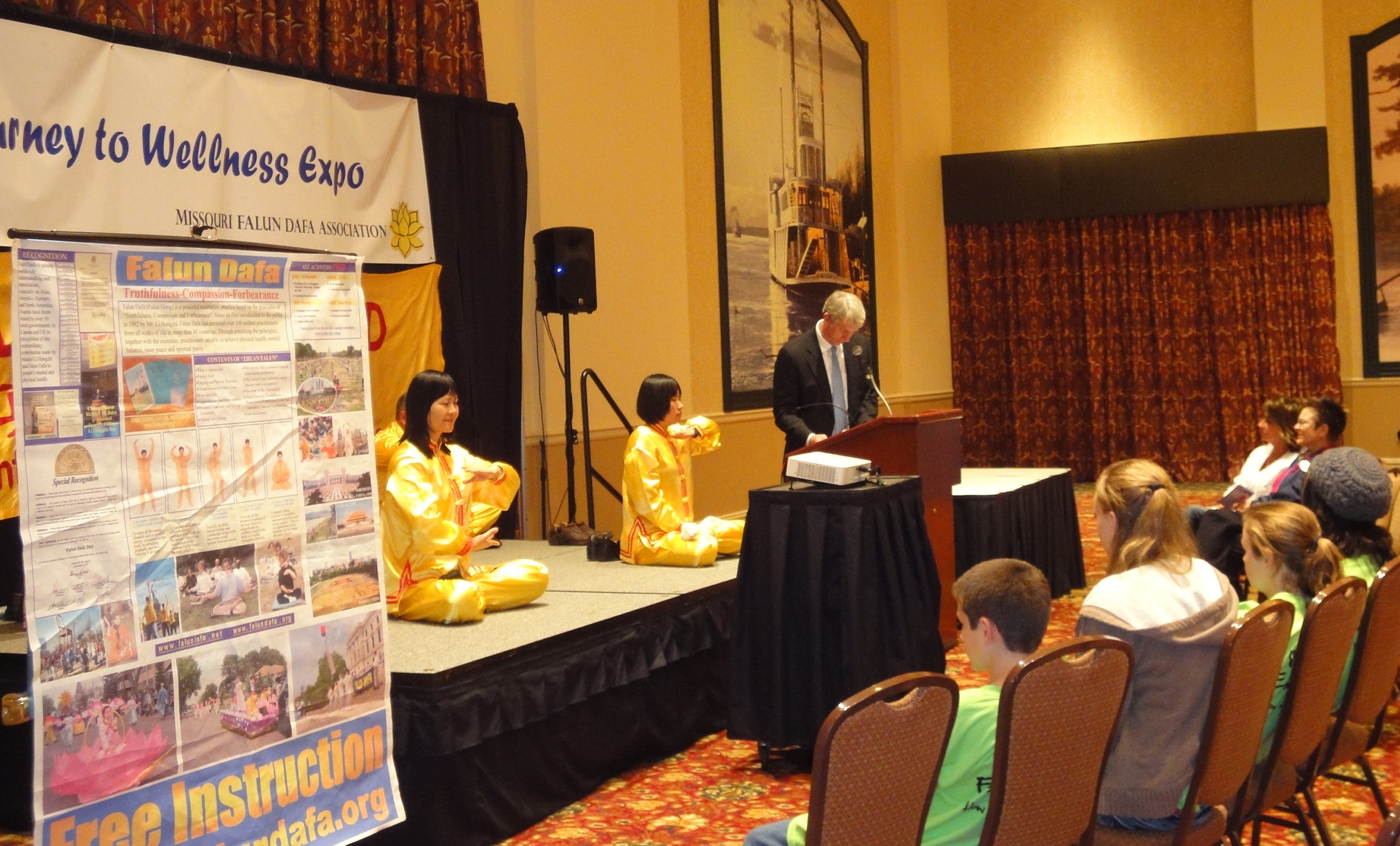 在功法演示会上,人们兴致勃勃地看着学员们的炼功动作。圣路易法轮功学员科辛斯基(Kosinski)博士向观众介绍了五套功法的原理,并告诉人们,在中国,有数以千万计的中国人为了身心的健康而走进法轮功修炼,并按照“真、善、忍”的教导,成为身心健康而道德高尚的一个群体。但是今天,这个善良的群体,却正在遭受共产极权的残酷迫害……