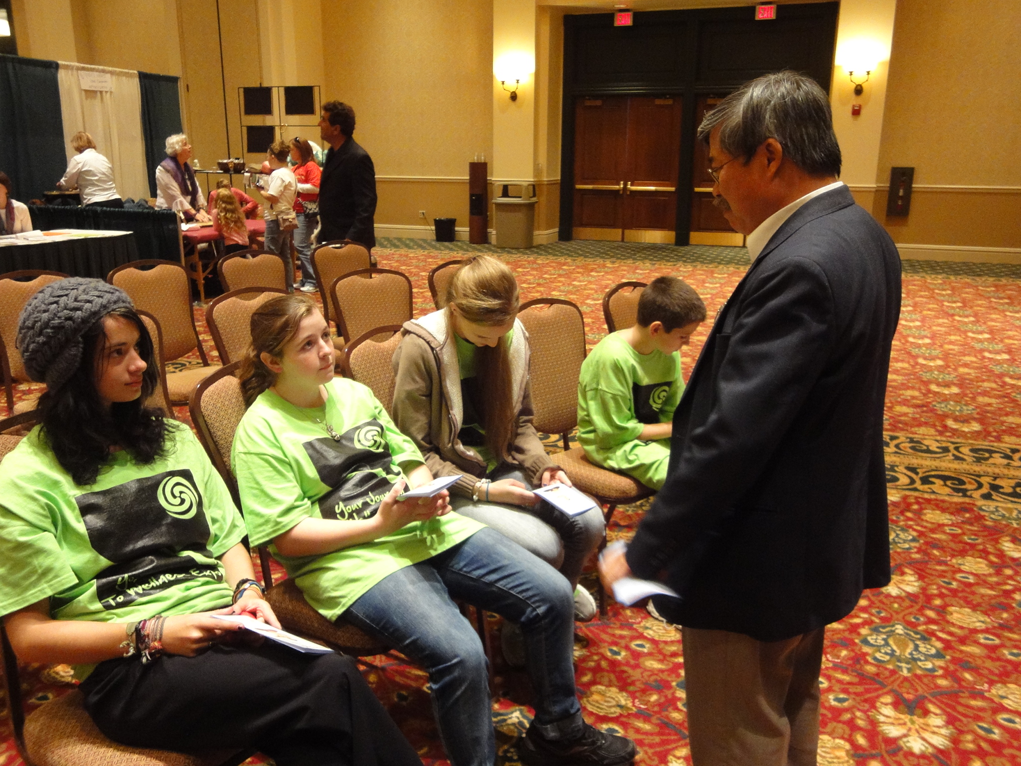 一群年轻的学生,都是博览会的义工。他们很认真地观看了学员们的功法演示。学员告诉他们,在世界上有很多象他们一样年龄的学生在学法轮功,因为法轮功并不只是为了祛病健身,他可以开启人们的智慧和灵感,让人们在各个方面都受益。